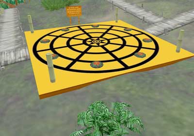 A close-up view of the Healing Hut where visitors can send and receive healing, cast a petroglyph cube, and get Dynamind instructions.